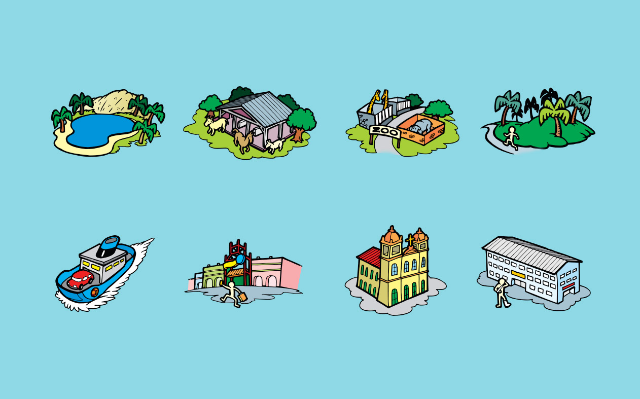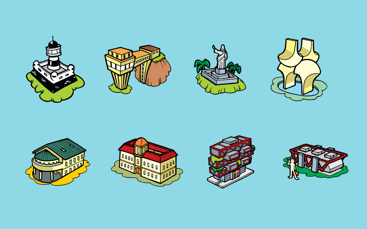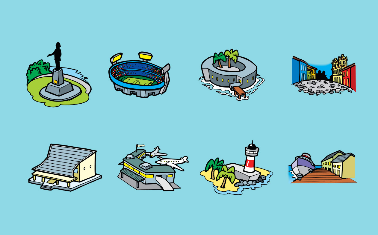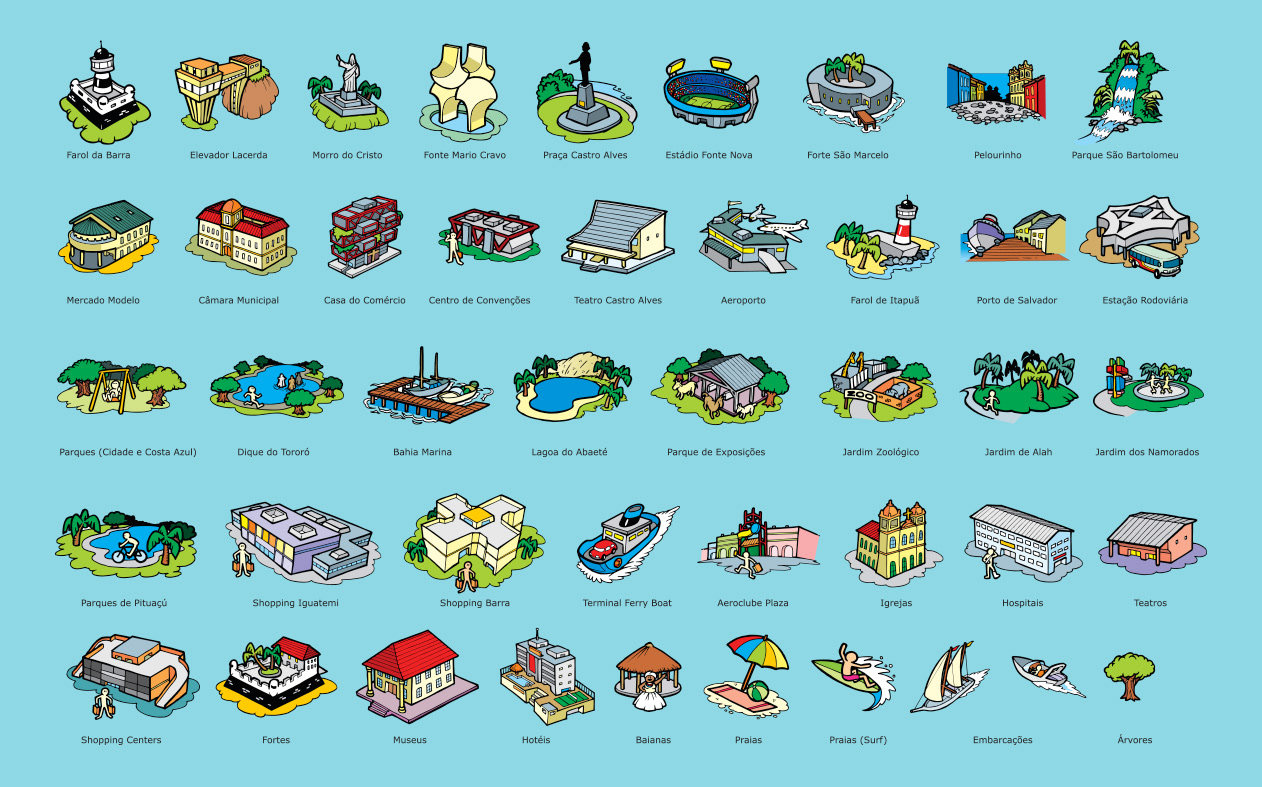 Illustration of icons of main sights of Salvador to virtual map Emtursa (current Saltur). Salvador, BA