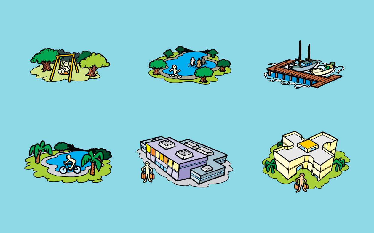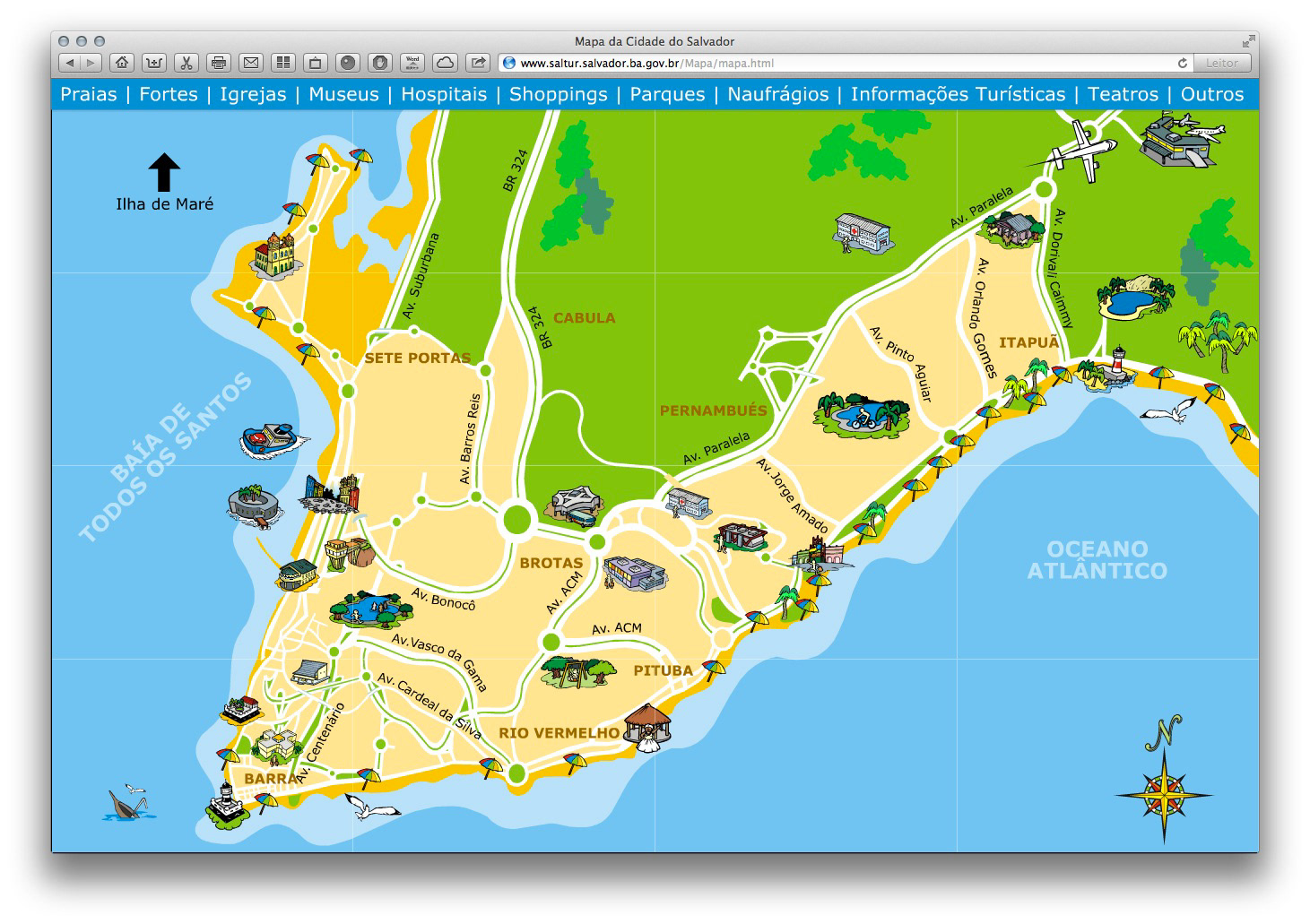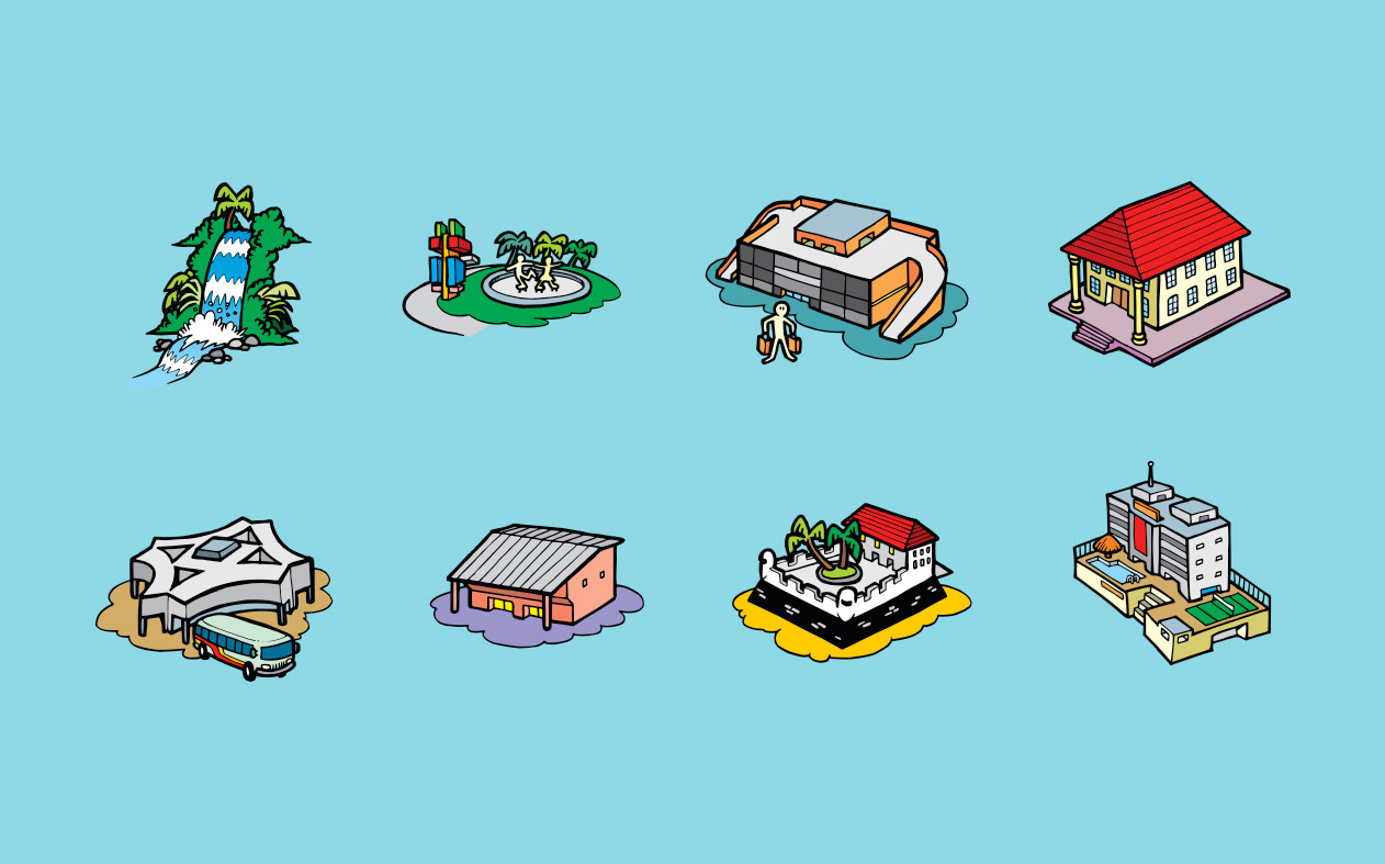 Illustration of icons of main sights of Salvador to virtual map Emtursa (current Saltur). Salvador, BA